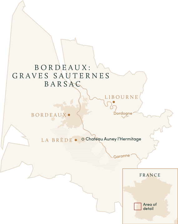 Known as Chateau Le Chec until 2012, when its long-time owners changed the name to Auney l'Hermitage, the estate is run by Sylvie and Christian Auney. They produce two cuvees each of red and white wine, favoring Merlot and Semillon in their respective blends. Graves Blanc and Graves Rouge are the core wines of Auney l'Hermitage, and make up the bulk of its production, while the best parcels are dedicated to their higher-end red and white "Cuvee Cana" bottlings.