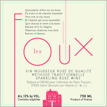 “Les Foux” is a méthode traditionnelle sparkling rosé comprised of 100% Cabernet Franc from 30-year-old vines surrounding their 16th century chateau in the village of Thouars. The wine spends nine months on the lees, disgorged with a minimal 2.6 g/L dosage. It is chiseled and elegant, fresh and lively, with crisp cherry and spiced plum flavors that glide along the long, balanced finish.