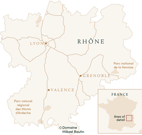Our first encounter with Mikael Boutin occurred last February in the tiny and charming village of Rasteau. Mikael, who was directed to us through an acquaintance from New Orleans, solicited us out of the blue, via email. Intrigued by the details of his small domaine and excited at the prospect of adding this appellation to our portfolio, we happily made some time in our schedule to stop by and take a look. We might have walked right by his unassuming place, located just off the town square, if not for the small plaque affixed to the side of the building. Making our way inside, we soon found ourselves seated around his dinner table with two bottles of Rasteau-the only wine he makes-in front of us: his 2014 and 2015. Mikael, a slightly serious but gracious fellow, briefly told his story and presented us with these two wines that showed honesty, personality and promise. A short walk up the hill brought us to a small building, barely larger than a two-car garage, which represented the totality of his production facility. The inside contained a few large concrete tanks, a small, manually operated basket press-and little else. In an area where we are frequently solicited by larger producers making wines that lack character and soul, we could not help but be captivated by Boutin's intimate and modest venue. Needless to say, we knew we had found our man in Rasteau.