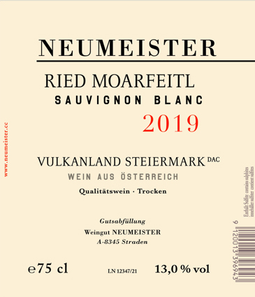 The renowned grand cru Moarfeitl occupies a south-southwest-facing plateau situated above the Augenweide vineyard at 340 meters altitude. Neumeister planted two hectares of vines here in 1990, and Moarfeitl’s soils of sand, loam, and gravel are intermixed with volcanic elements, lending the Sauvignon Blanc from this site a distinctively assertive and profound mineral character. In accordance with the stringent requirements for GSTK (“Grosse STK Ried”) status, this spends 18 months in used oak casks between five and 25 hectoliters in capacity; like all of Neumeister’s wines, it undergoes a pre-fermentation maceration on its skins for several days before fermentation commences spontaneously.