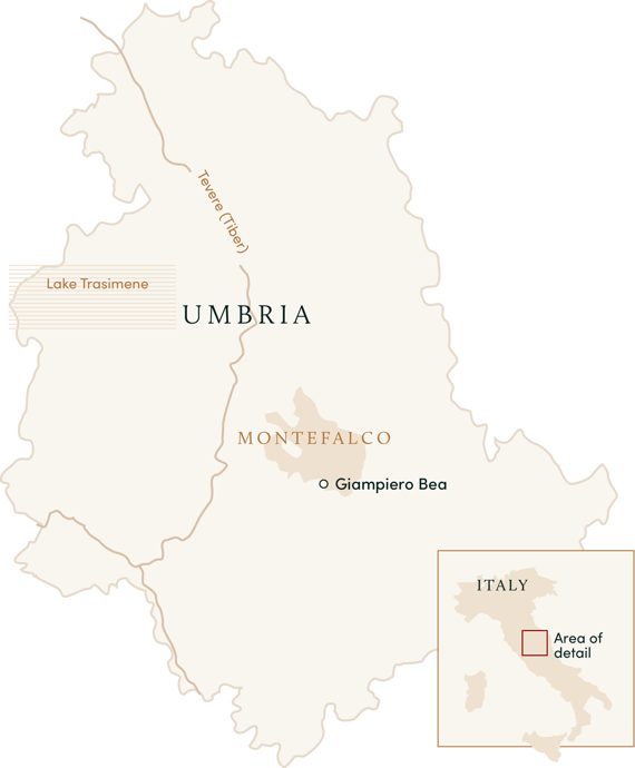 References in the archives of Montefalco, the beautiful hill town in Umbria, document the presence of the Bea family in this locality as early as 1500. Azienda Agricola Paolo Bea is a classic Italian fattoria, producing wine, raising farm animals for trade and home consumption, and working the land to produce olives, fruits, and vegetables. At the time Neal began working with the family in the late 1980s, a young and ambitious Giampiero Bea was learning the ropes alongside his father Paolo-a through-and-through farmer with an Umbrian dialect so thick as to be nearly incomprehensible to outsiders. Paolo produced shockingly expressive wines using a bare minimum of technology, and while these staunchly old-school wines were out of step with the modernization-happy Italian trends of the 1980s and 1990s, they resonated deeply with Neal and with our clients-and they continue to do so decades later. Giampiero has long been at the helm of Azienda Agricola Paolo Bea, and his commitment to healthy farming and low-intervention cellar work has made him a pillar in the Italian natural wine community. But it is Paolo's approach-so bred-in-bone as to seem instinctual-that guides the estate to this day, given voice and definition through Giampiero's remarkable work.
