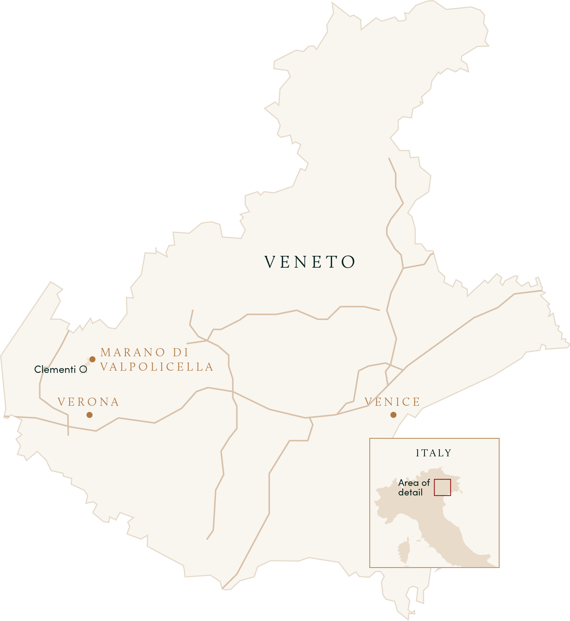The estate encompasses 14 contiguous hectares of vineyards extending from the winery itself, situated at 350 meters altitude, up to over 400 meters further into the hills, and exposed southward, southwestward, and westward. Planted to roughly 65% Corvina, 30% Rondinella, and 5% Molinara (plus a touch of Osoleta), most of Clementi's vines are trained in the old local Pergola Veronese method, whereby bunches grow far above the ground, protected from the sun by leaf cover and from surface moisture by their height. Now under the guidance of Pietro's children Bernardino, Maria, and Maurizio, the Clementi estate uses no synthetic chemicals in their vineyards, and all fruit is harvested by hand.